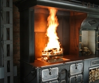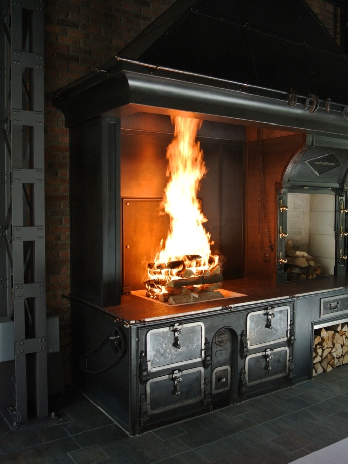 Heute erstrahlt die ehemalige Garage in ungeahntem Glanz: Der Grill aus Chromstahl lässt sich mühelos in der Höhe verstellen; möglich macht dies ein über eine Kurbelwelle übersetzter Antrieb. Die Zuluft für den Betrieb der Feuerstelle wird in einem im Inneren der Anlage geführten Kanal vorgewärmt und hernach durch einen Austritt in der Haube der Raumluft zugeführt. Die Reling am Sims und am Unterbau wurden bauseitig angebracht.