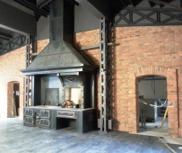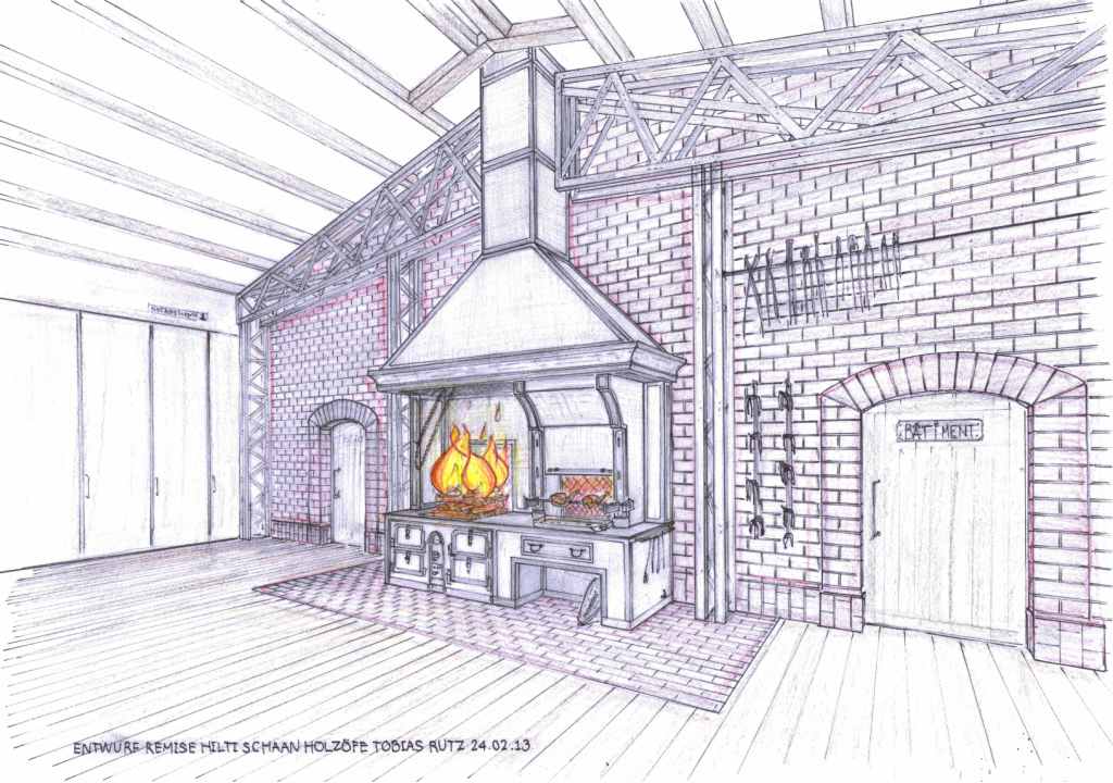 Am Anfang des Projekts in Schaan/ Liechtenstein stand eine Garage. Sie sollte in eine stilvolle Remise verwandelt werden, inklusive Grillanlage. Keine leichte Aufgabe! Ausgehend von den Vorgaben des Kunden und den Bauteilen, die bereits vorhanden waren (eine Herdfront und ein Rotisseur aus Gusseisen), machten wir uns ans Werk. Alte Dokumentationen französischer Küchenfeuerungen dienten dabei als Inspiration.